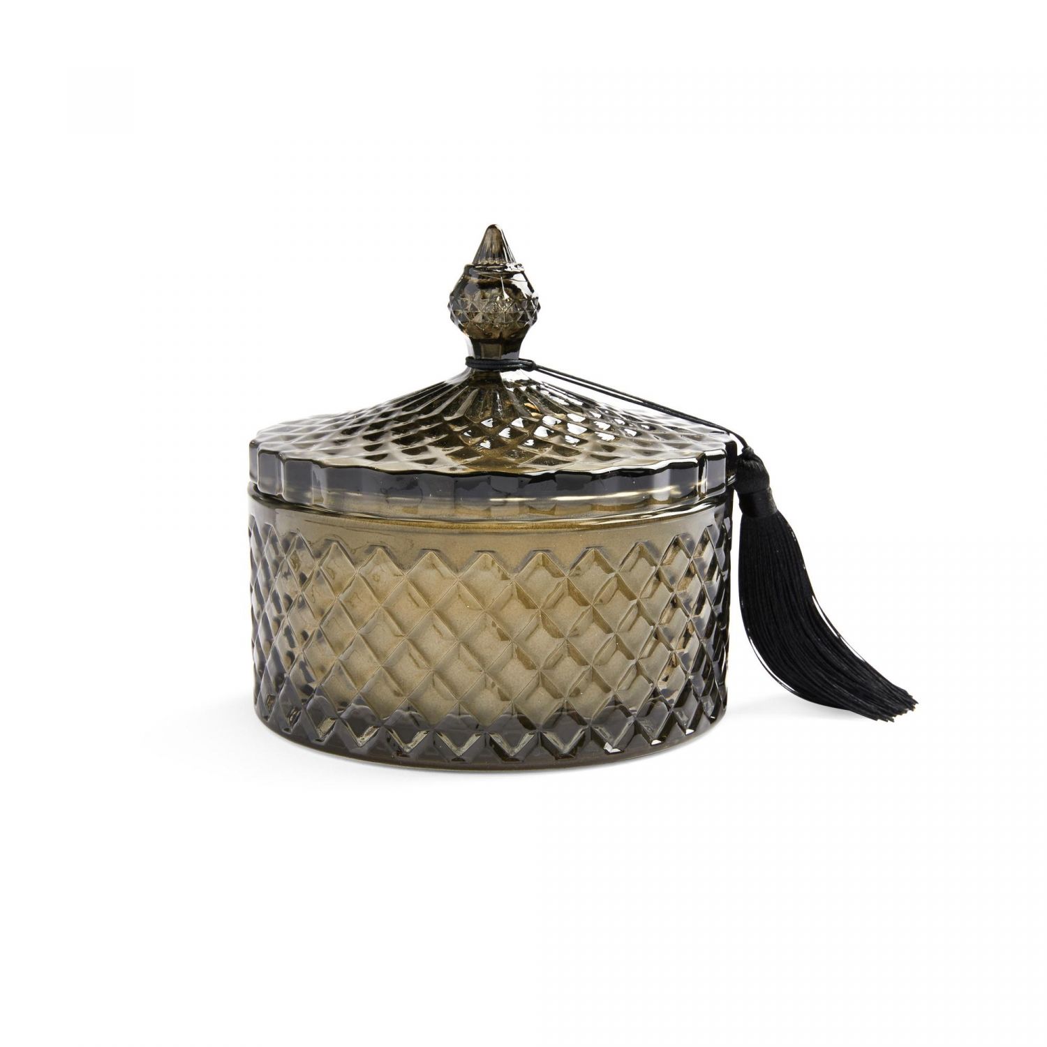Se trata de una vela de tres mechas que viene dentro de un tarro de cristal de color ahumado. Con tapa y una bonita borla que le pone el broche de oro. Todo esto la convierte en un objeto decorativo de estilo vintage que no pasa desapercibido.