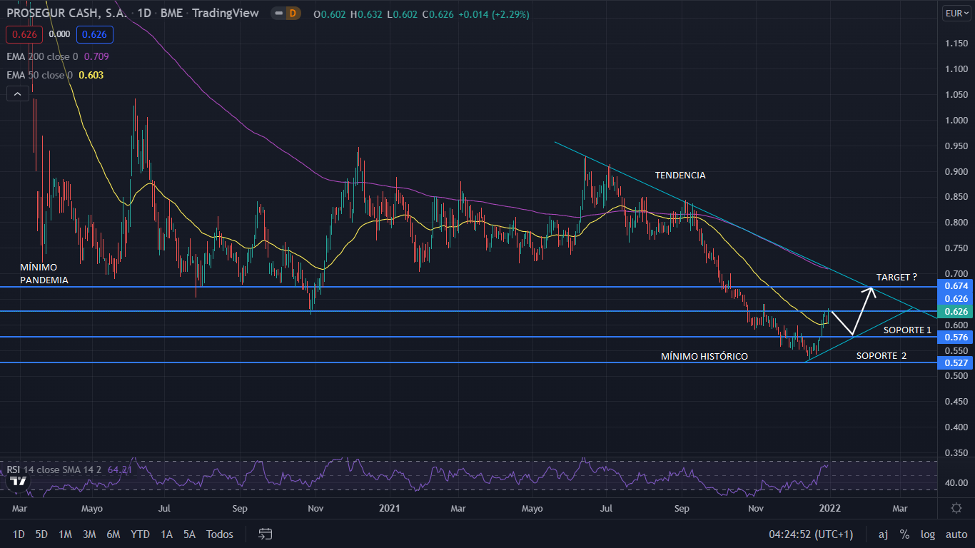 A nivel técnico, desde la caída por la pandemia, Prosegur Cash se movió latera, con movimientos superiores 50%. Definitivamente el precio paso a bajista, perdiendo el soporte de los 0,62 euros, hasta marcar un nuevo mínimo histórico en los 0,52 euros, siendo una caída del 41%. Tras la publicación del dividendo el pasado día 21 de diciembre, el precio ha subido un 16%. Actualmente el precio se sitúa en los 0,62 euros, nivel clave para Prosegur Cash. Para el corto plazo, debido a la fuerte subida, con probabilidad el precio corregirá hasta el soporte de los 0,57 euros. De no perder dicho soporte, el precio volverá a alcista para ir a buscar la línea de tendencia bajista en los 0,67 euros.
