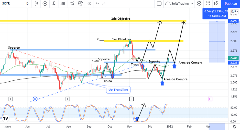 En este momento el precio ya se encuentra trabajando por encima de las medias móviles exponenciales de 52 250 periodos con lo cual, al primer retroceso que realice el precio al soporte más importante y cercano que data de septiembre y que al mismo tiempo se confirma para el 8 de diciembre en inmediaciones de los 2,2 euros por acción, será oportunidad clara de adherir en compras en las acciones de Sacyr con un primer objetivo que lo ubicamos en los máximos de noviembre de 2021 en inmediaciones de los 2,5 euros por acción para posteriormente llevar el precio al segundo objetivo arriba de los 2,7 euros por acción que corresponde a los máximos de febrero de 2020 donde se ubicaba el precio antes de la llegada de la pandemia. Operación que otorgará entre un 12% y 25% de rentabilidad en el mediano y largo plazo.