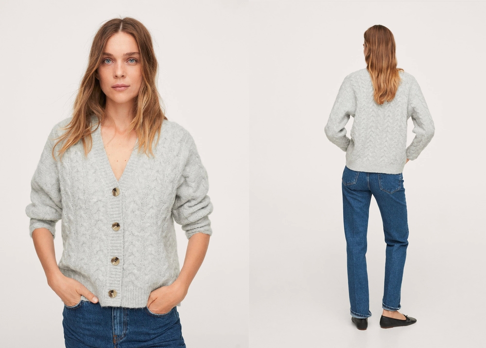 También tienes en Mango la versión del anterior en cárdigan. Disponible en varias tallas y los mismos colores que el anterior. En este caso el precio es también de 22,99€ tras un descuento idéntico.