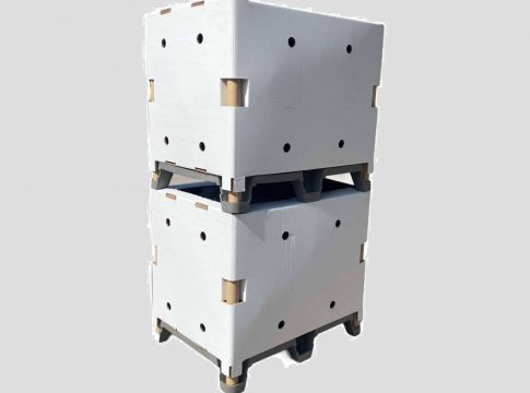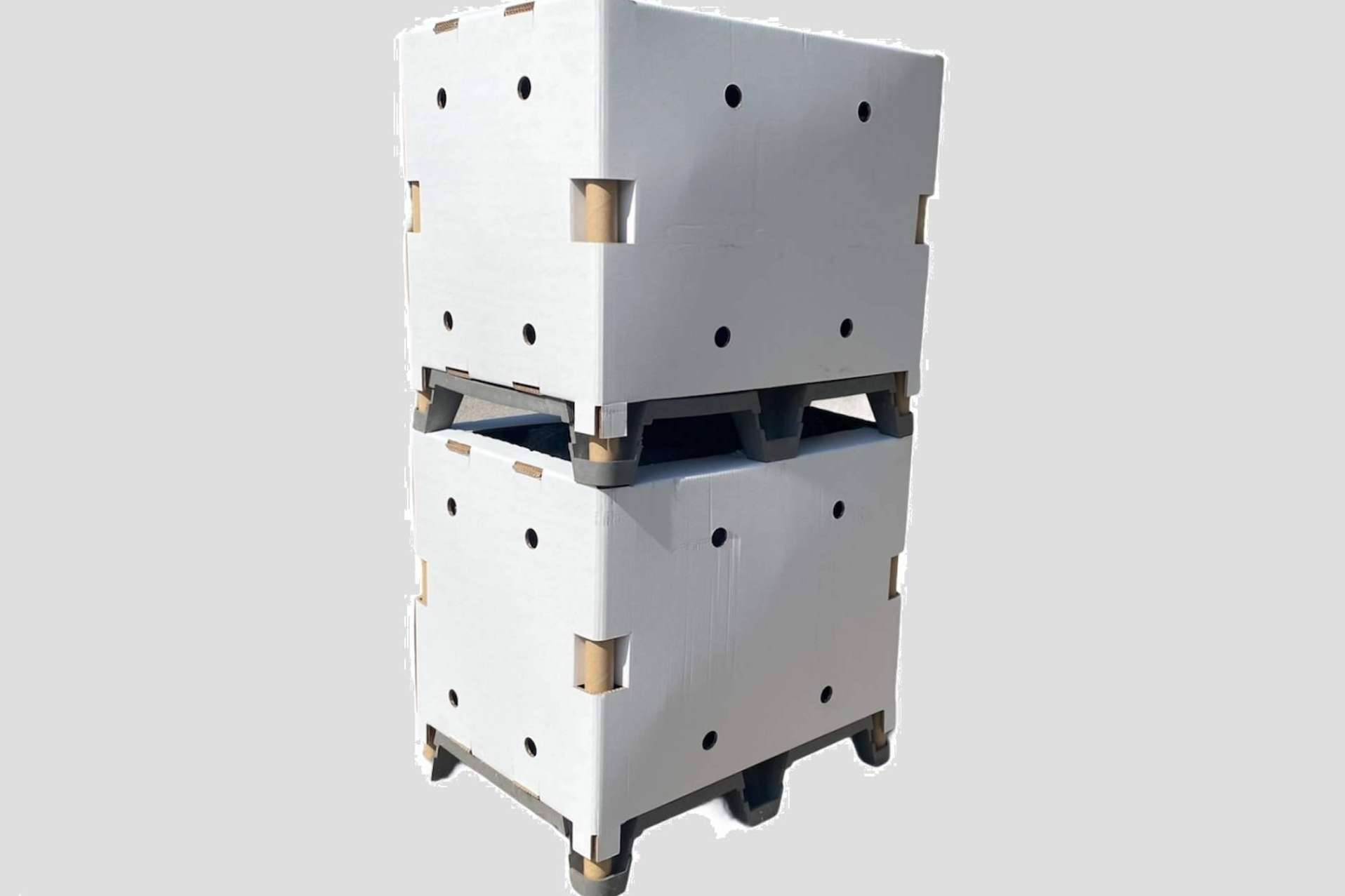 La estructura consta de un Ecoplastic palé, encajable y apilable como base, para proteger la mercancía de cualquier golpe o manipulación inadecuada. Los cajones de cartón doble son fijados en el palé por tubos de cartón doble que permiten máxima estabilidad durante la movilización de los productos.