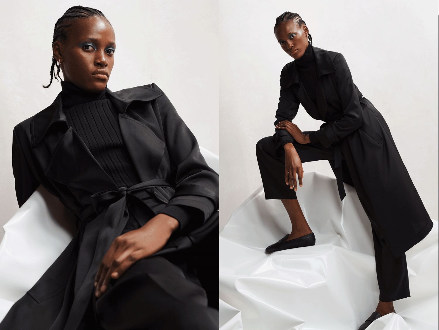 Por otro lado también está el jersey de la modelo con cuello alto de canalé en tono negro a juego por 12€, así como el pantalón de pinzas con acabado satén negro por 22€. Así tendrás el look total para el invierno.