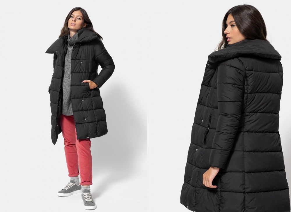 Una parka larga, con cuello envolvente, relleno para el acolchado que aísla mejor del frío, y con materiales reciclados. Con dos bolsillos laterales y cierre frontal con cremallera. Solo emplea poliéster para toda su composición.