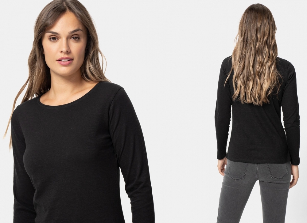Esta camiseta para mujer es muy básica, lisa, con manga larga, cuello redondo, y cómoda. Confeccionada en fibras de 100% algodón. Sus tonos suaves hacen que puedan combinar con multitud de prendas.