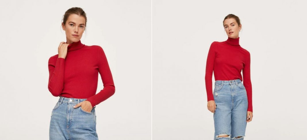 Vamos con un jersey de cuello alto y vuelto ideal para los días más fríos y cuidar la garganta, sin descuidar la moda. Este es perfecto, incluido por su precio de 19,99 euros. En Mango se vende en gris, negro, marrón y rojo. Por este precio igual te conviene comprar más de uno, o alguno para regalo, de paso. Está realizado en tejido de punto fino, con diseño recto y panel de canalé.