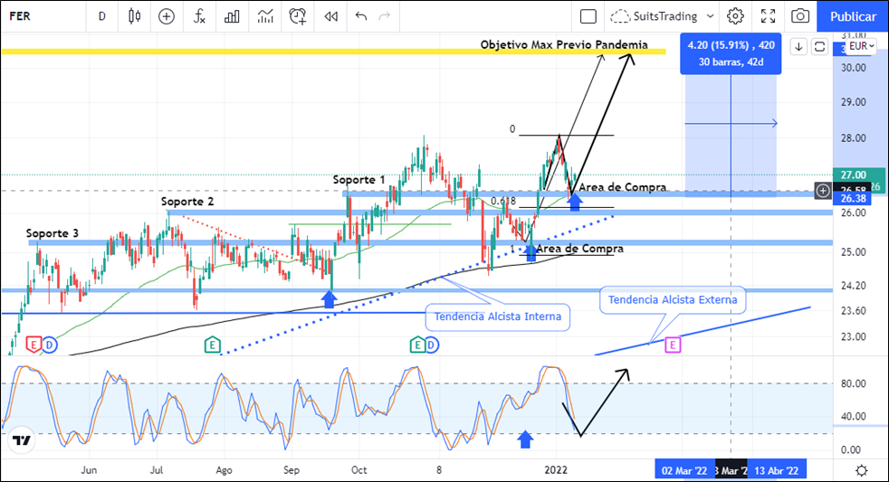 El pasado 9 de diciembre compartíamos a través de nuestra web, un artículo en el que mostrábamos las áreas de compra para la acción de Ferrovial en busca de esos movimientos de continuación alcista que la llevarán a los niveles previos a la pandemia arriba de los 30 euros por acción.