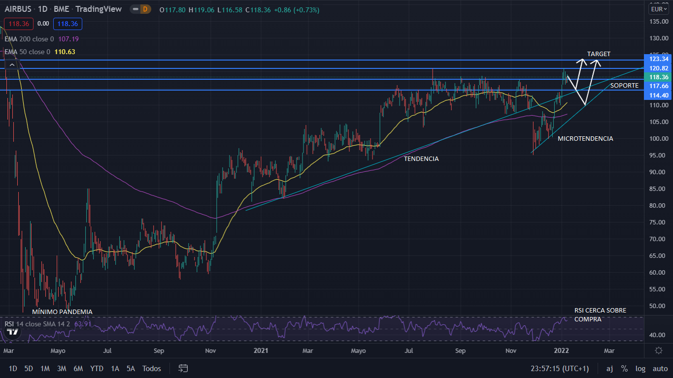 A nivel técnico, desde el mes de enero de 2021, Airbus se ha movido en una tendencia alcista, creciendo hasta un 40%. Con los 118 euros como resistencia fuerte, Airbus perdió en noviembre un 19%, situando el precio en los 95 euros. Desde el 26 de noviembre su precio ha subido un 24%, superando dicha resistencia. Habiendo cumplido sus objetivos comerciales, los resultados para Airbus al cierre del ejercicio de 2021 serán positivos, lo que impulsara a sus acciones un paso más cerca de reocupar los niveles anteriores a la pandemia. Actualmente el precio se sitúa a un 17% de su nivel precovid, siendo este los 140 euros. Para el corto plazo, debido a la fuerte subida, el precio corregirá hasta los 114-110 euros antes de continuar alcista. La publicación de resultados de 2021 está prevista para el 17 de febrero de 2022.
