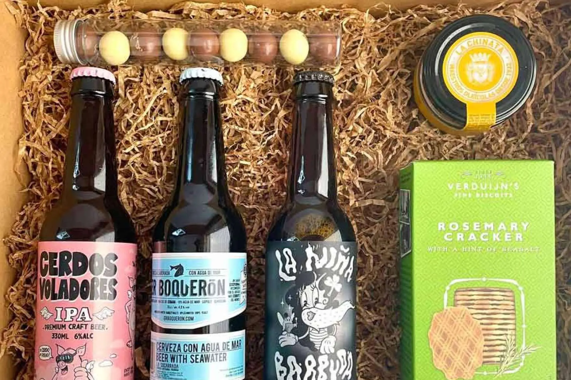 Cajas como la Beer & Love, protagonizada por un tercio de cerveza artesanal, más una taza con mensaje a elegir, taquitos de jamón ibérico y un sobre de regañá conforman un regalo perfecto. Cava semiseco, sobres de paleta de bellota ibérica, bloc de foie gras, mermelada de kiwi al cava, queso de oveja curado, chocolates belgas, picos gourmet con aceite de oliva y muchos más rubros llegarán a su destino dentro de hermosas cestas.