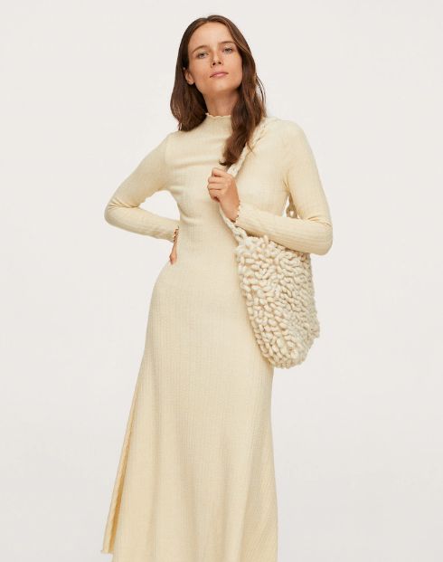 Este vestido es uno de los más bonitos que vas a poder encontrar no solo en Mango sino en cualquier cadena de moda. Destaca por tener un tejido de punto con textura de espiga y un diseño recto de canalé. Además tiene las mangas pespunteadas. Como está rebajado su precio se queda en 22’99 euros.