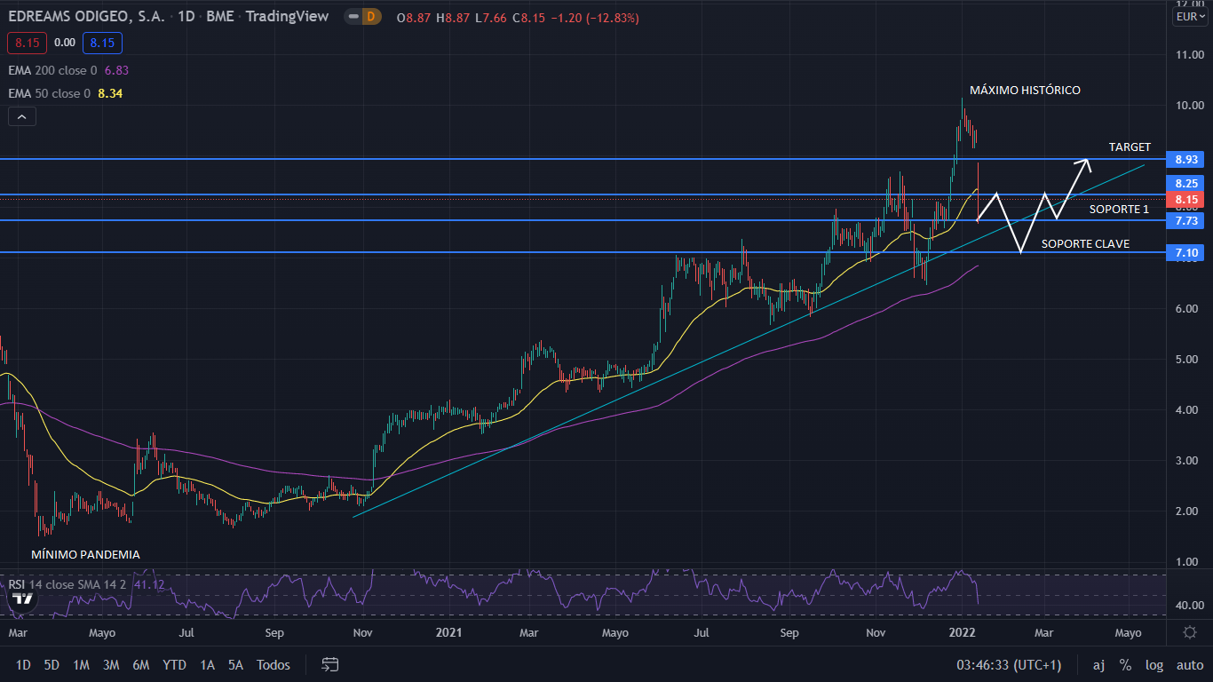 A nivel técnico, desde noviembre de 2020, eDreams ha sido alcista, con un crecimiento del 362%. Alcanzando su máximo histórico en los 10 euros. Tras dicho máximo, alcanzado el pasado 3 de enero, el precio ha caído perdiendo un 24%, debido a lo explicado anteriormente. Con la posición solida de la compañía, los buenos resultados financieros, y su éxito del plan Prime, el precio recuperar su cauce alcista, situándose sobre los 8,93 euros, al cierre del primer trimestre de 2022.