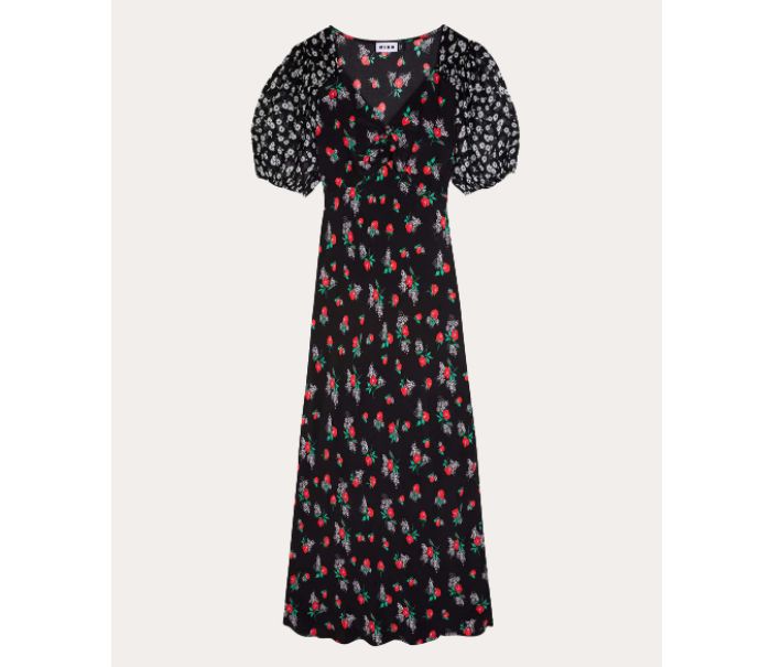 Esta propuesta es totalmente diferente a las vistas hasta ahora, al ser más alegre en su diseño y menos clásico. Es un vestido midi de seda estampado de Rixo con escote en pico y mangas abullonadas con pequeños puños. Una preciosa prenda para lucir en ocasiones especiales, cómodo, vaporoso y en tendencia. Con el 50% de descuento en El Corte Inglés se queda en 180 euros, así que aprovecha y tienes aquí el enlace para comprarlo.