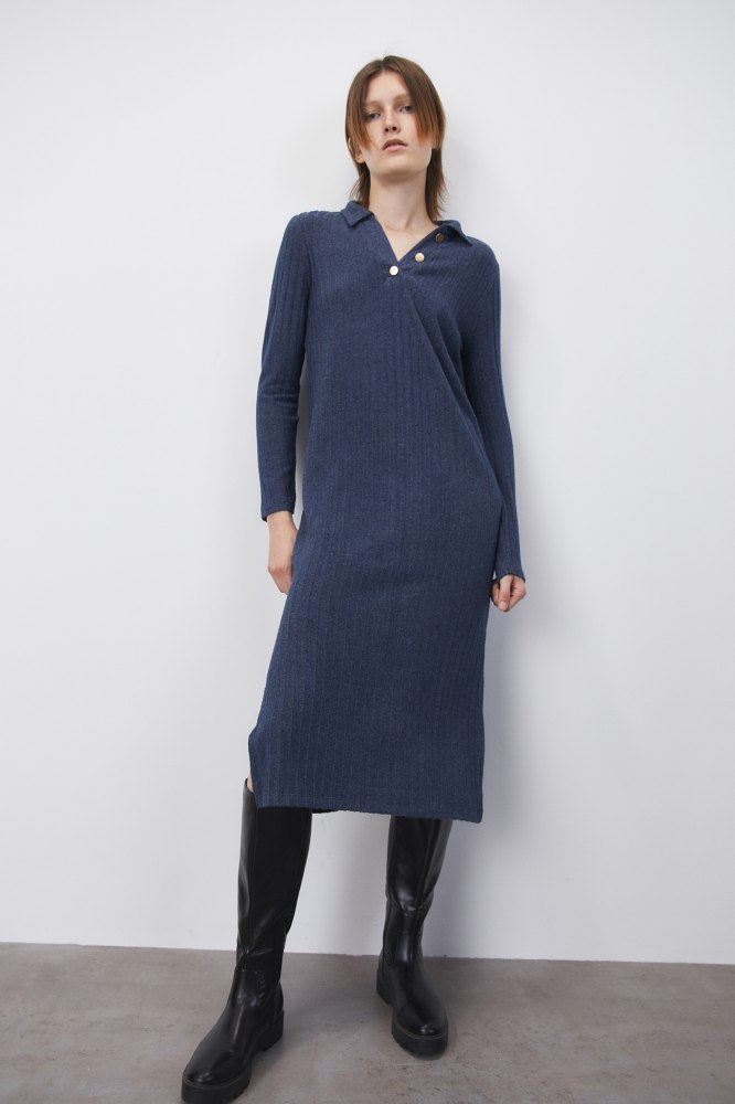 De nuevo recurrimos al vestido de canalé, porque es una prenda muy versátil para esta época tan fría. Este modelo en concreto es de manga larga, con cuello tipo polo y cierre mediante botones. Con corte midi.