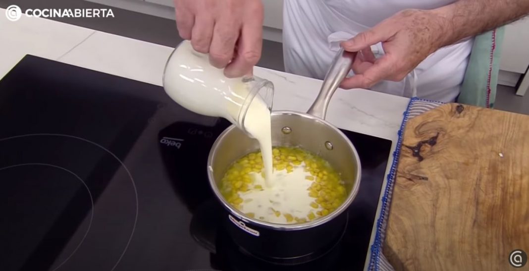 Es el turno de la nata, el vino blanco y el maíz cocido. Lo echamos en la cazuela todo y lo dejamos a fuego suave. Mientras, el cocinero vasco se dispone a preparar las alitas para meter en el horno.