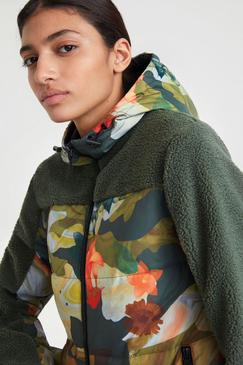 Si quieres hacerte un conjunto para entrenar sin pasar nada de frío, puedes combinar el legging anterior con esta original chaqueta bimateria. Combina el tejido padded con el canesú y las mangas de borreguito.