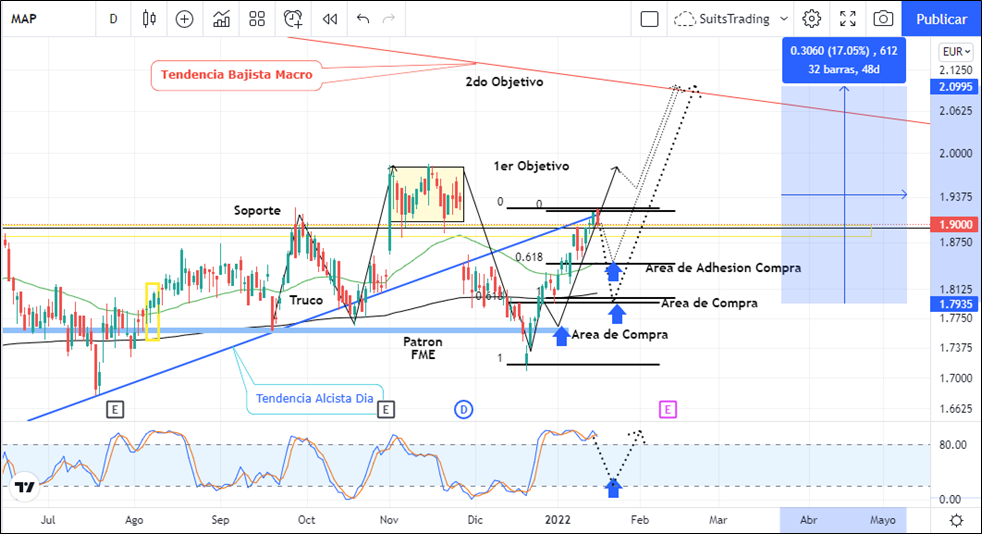 De esta forma, si el precio visita nuevamente áreas entre 1,80 y 1,83 euros y respeta el área regularidad en el 61,8 de retroceso de Fibonacci respetando al mismo tiempo las medias móviles exponenciales, daría la oportunidad de adherir en compras para buscar como primer objetivo los máximos de noviembre arriba de 1,98 euros. Posteriormente buscaríamos un segundo objetivo en relación con la tendencia bajista macro por encima de los 2 euros, operación que otorgaría entre un 8% a un 17% de beneficio para 2022.