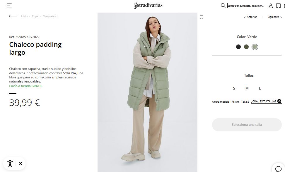 Es un hermoso chaleco con capucha, cuello subido y bolsillos delanteros. Por lo que, es otra de las prendas que no puede faltar en el closet en una mujer. Además, este está confeccionado con fibra SORONA, una fibra que para su confección emplea recursos naturales renovables. Siendo perfecto de usar en las temporadas de invierno. Para que puedan comprar este chaleco sólo tienen que entrar a Stradivarius por 39,99 €.
