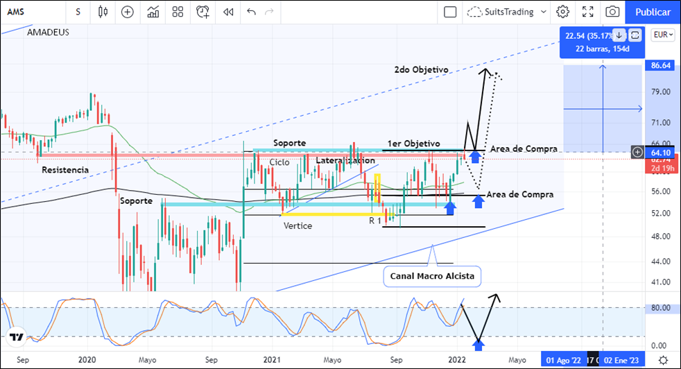 Desde el pasado 23 de diciembre compartimos a través de nuestra web inversión.es, un artículo con proyección al alza la cual de momento ha cumplido el primer objetivo que corresponde a más del 12% de beneficio visitando niveles de resistencia y soporte en inmediaciones de los 64,4 por acción. Para este caso es importante tener en cuenta que, en gráfico mensual, la acción de Amadeus viene trabajando un canal alcista macro que se comienza a desarrollar desde los mínimos históricos logrados en 2002.