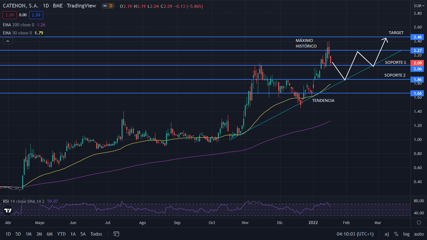 A nivel técnico, tras el crecimiento iniciado en abril del 2021, el precio de Catenon ha crecido año un 706%, situando su máximo histórico en los 2,40 euros. Actualmente Catenon se encuentra próximo a una corrección, para ir a buscar el soporte de los 1,86 euros, junto a la línea de tendencia alcista. De continuar dentro de dicha tendencia, e impulsado por sus buenos resultados, el precio volvería a alcista, con los 2,46 euros como objetivo.