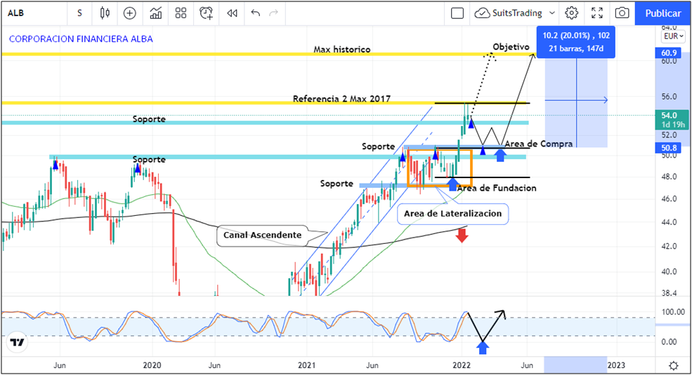 Retomando el punto técnico, prevemos en el gráfico del marco semanal para los próximos días un posible retroceso que vaya a visitar nuevamente los 50 euros por acción.Allíconfluyen el área de regularidad del mercado en el 61,8 de retroceso de Fibonacci de la última extensión con los soportes que ha dejado entre mayo y diciembre de 2020 y agosto y noviembre de 2021 arriba de 50 euros. Por otro lado, encontramos que el índice de fuerza relativa se ubica por encima de los 100 puntos dando señal de sobrecompra con lo cual, es lógico pensar en retrocesos para adherir posición de compra con un objetivo estimado en los niveles máximos históricos arriba de 60 euros por acción lo que nos daría un +20% de beneficio para el corto y mediano plazo.