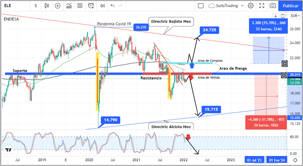 Al cierre de 2021Endesa no fue capaz de quebrar la resistencia más importante que tiene en contra que data del primero de marzo en 20,19 euros con lo cual, desde la primera sesión de 2022, el precio rechazódicha resistenciadesvalorizándose más de un -5% durante las 2 primeras semanas de cotización.De momento y gracias al repunte de esta semana, la acción de Endesa se deja el -3%, porcentaje un tanto tímidopero que, debido a su estructura, preocupa a los analistas técnicos y genera presiónen el mercado institucional.