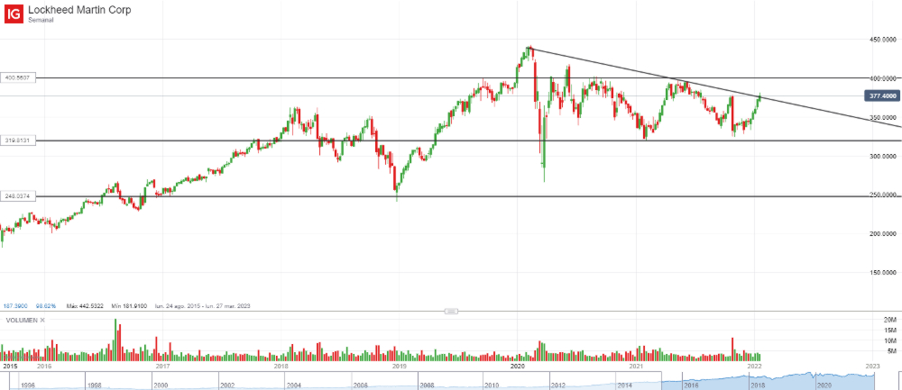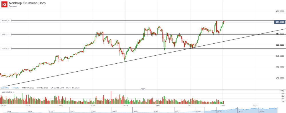 Northrop Grumman se encuentra en zona de máximos históricos. Desde este pasado jueves, ha realizado un doble techo en los 402 dólares. No obstante, «la empresa trae un recorrido muy positivo, con una tendencia alcista en la última década, pero con mayor revuelo en los últimos años debido a las turbulencias de la pandemia».