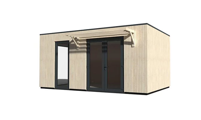 Este modelo es sencillo, minimalista, discreto y muy práctico. Se trata de la mini casa Studio de Leroy Merlin, con una superficie de 19,57 m² y fabricada con paneles de madera de abeto nórdico natural muy resistente gracias a su grosor de 97 mm. Es de color claro con detalles en verde, y tiene ventanas de PVC y una puerta acristalada doble batiente. Encima de la puerta tiene una estructura que se puede utilizar para colocar un toldo. Ideal como pequeña casita supletoria, o como estudio para trabajar con total tranquilidad. El precio es de 11.999,00 €.