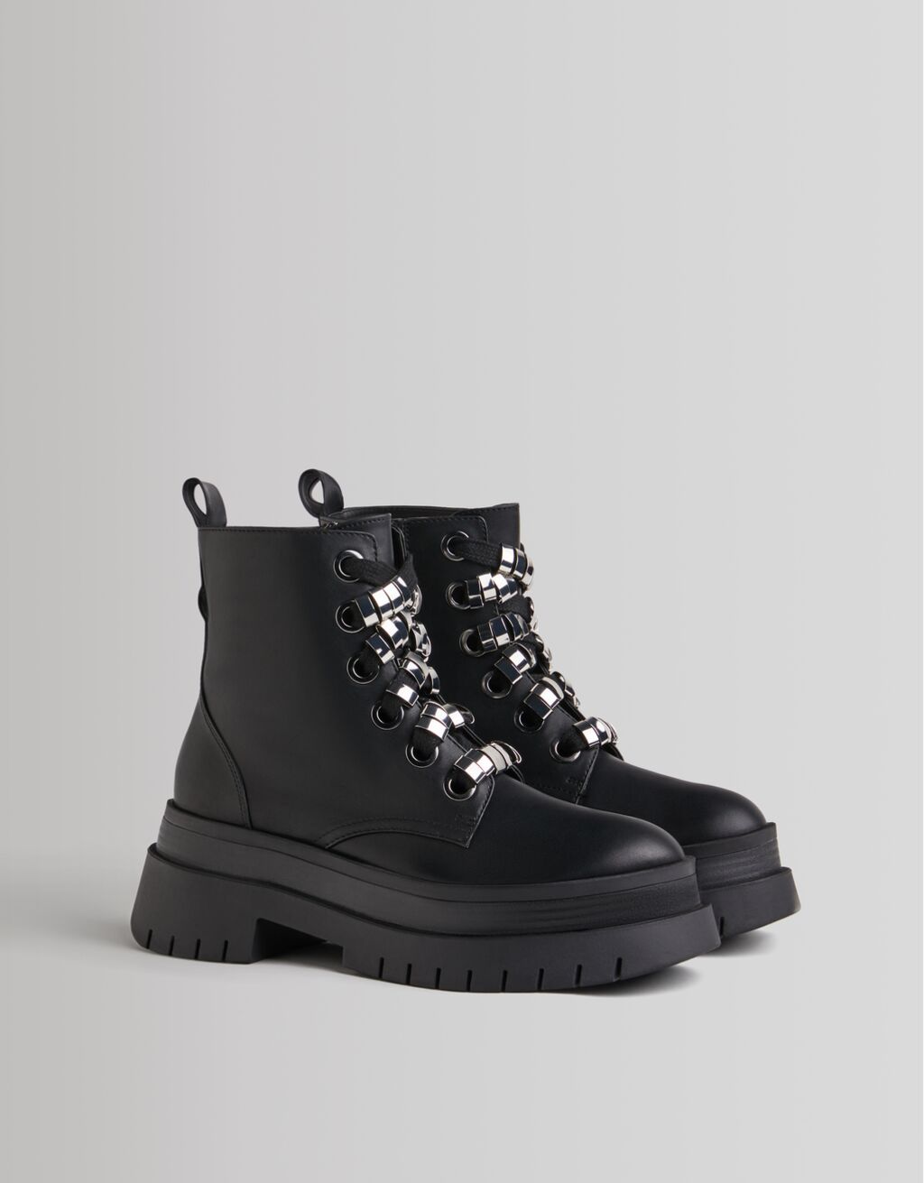 Algo cómodo que protegerá en todo momento, son los Botines plataforma adornos metálicos, que tienen en rebaja las tiendas Bershka. Por solo 12,99 euros puedes llevártelos, en color negro, con una plataforma de 4 centímetros.