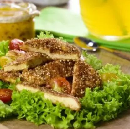 Mezcla en un bol unas pechugas de pello rebozadas con un poco de amaranto, unos tomates cherrys, unas hojas de lechuga y un aliño a base de salsa vinagreta y ya verás como no vuelves a echar de menos nunca más la ensaladilla a la hora de la comida.