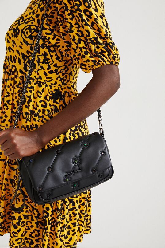Su acolchado efecto piel, provoca un efecto de cuero y tiene bordado un conjunto de lindas flores. Tiene un diseño consta de solapa y cierre de cremallera, con un bolsillo en su parte interior, en dos colores, negro y amarillo. Su precio 35,97 euros. Atenta a estas otras ofertas.