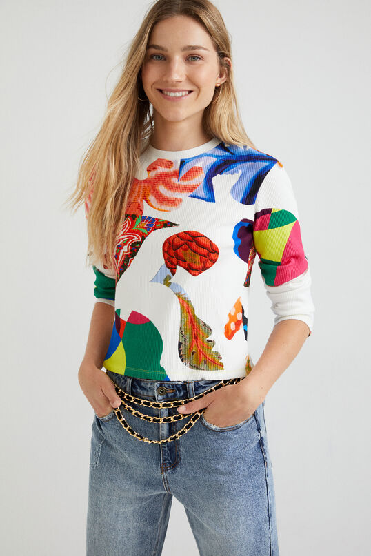 Destaca tu look juvenil con la Camiseta manga larga arty, con un precioso y vistoso estampado con un espectacular colorido. Elaborada en tejido acanalado, cuello redondo y sus mangas largas.