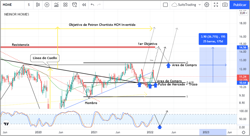 Desde mediados de 2021venimos siguiendo el comportamiento de las acciones de Neinor dada la estructura clásica del patrónhombro, cabeza, hombro hacia una senda alcista que incluso el pasado cuatro de enero, compartíamos en detalle dando un primerprecio de entrada en niveles de 10,68 euros. Desde las primeras entradas el precio ha alcanzado cerca del +11% de beneficio sin lograr atacar el máximo anterior arriba de los 12,7 euros por acción que sirve de precio de referencia.