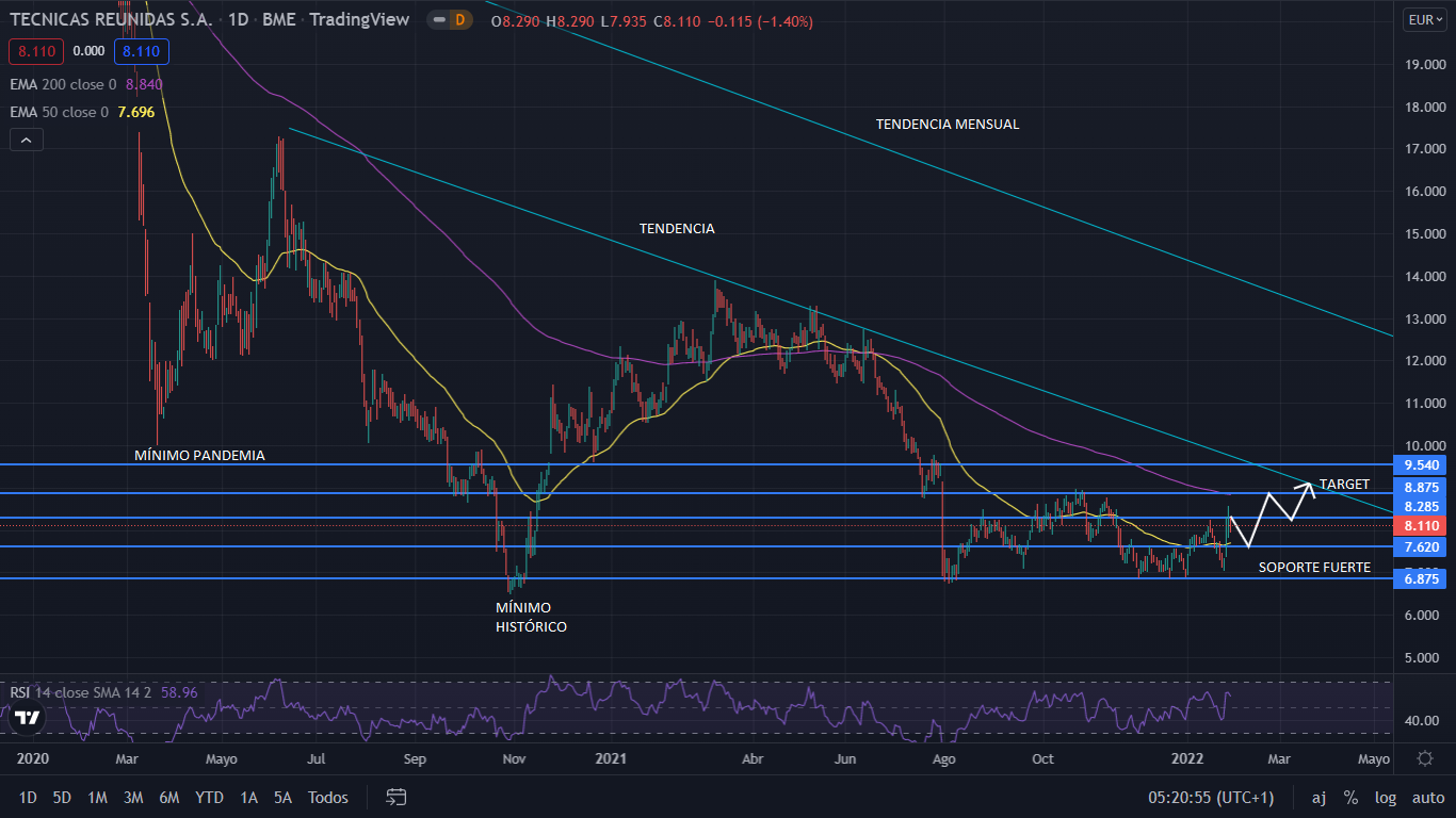 A nivel técnico, Técnicas Reunidas se encuentra en una tendencia bajista mensual, desde el año 2015. Tras la caída por la pandemia, el precio siguió cayendo, hasta marcar los 6,50 euros como mínimo histórico. Actualmente el precio se encuentra lateral, con los 6,87 euros como soporte fuerte. El pasado día 26 de enero, el precio subía con fuerza, dejando una subida del 14%. La proyección del precio para el corto-medio plazo, es alcista, para situarse sobre los 8,87 euros, junto a la línea de tendencia bajista. En el largo plazo, la proyección es bajista.