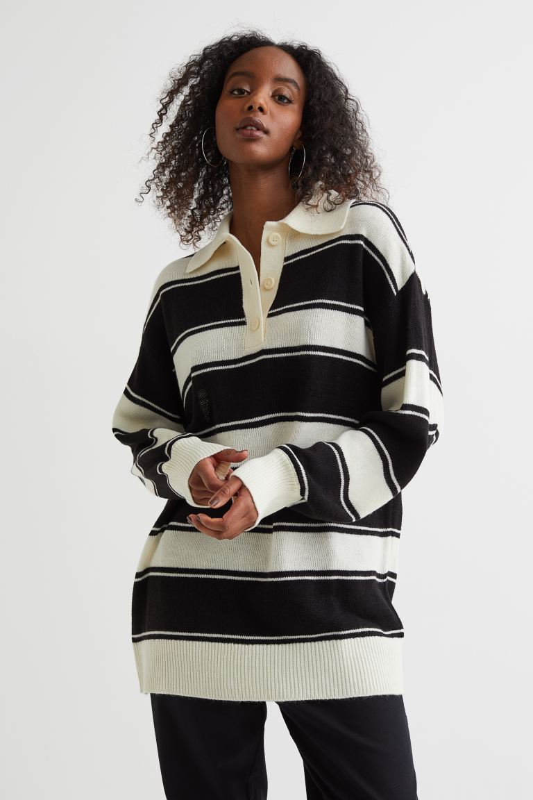 Tiene tapeta de botones y hombros caídos, así como una bonita combinación de colores en blanco y negro. Si te gustan los modelos de inspiración rugby, hay otra versión en negro y verde, pero con cuadros en lugar de rayas.