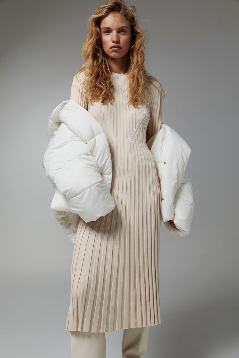 En invierno también puedes ir perfectamente arreglada con un vestido y sin pasar nada de frío. Por ejemplo, con este bonito vestido midi en punto de canalé. Con cuello redondo y mangas largas ajustadas.