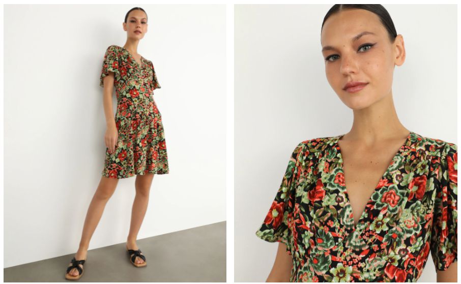 Volvemos con los vestidos cortos, en este caso con otro modelo que anuncia ya el verano, al menos por su colorido alegre, aunque también por su porte con el volante bajo, la manga corta con cuello pico, el corte debajo del pecho y el estampado de flores. Es un vestido versátil con el cuerpo ajustado y una falda fluida y con movimiento. Puedes combinar este vestido con sandalias o alpargatas y un bolso de rafia para conseguir un look de diez. Su precio, ya sabes, 19,99 euros y que puede ser tuyo en este enlace.