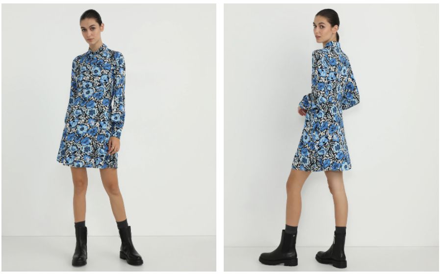 Vamos con un vestido de lo más atractivo, cerrado hasta el cuello, algo que también es tendencia. Una preciosidad que aúna alegría y elegancia fresca y que se vende en El Corte Inglés en gris y azul. Se trata de un modelo corto estampado con botones, de cuello camisero, y corte debajo del pecho. Está fabricado 100% en viscosa y el estampado es de estilo abstracto, aunque lo ves como floral. Un modelo perfecto para combinar con botas o botines, como ves en la foto. En este enlace lo puedes comprar por 19,99 euros.