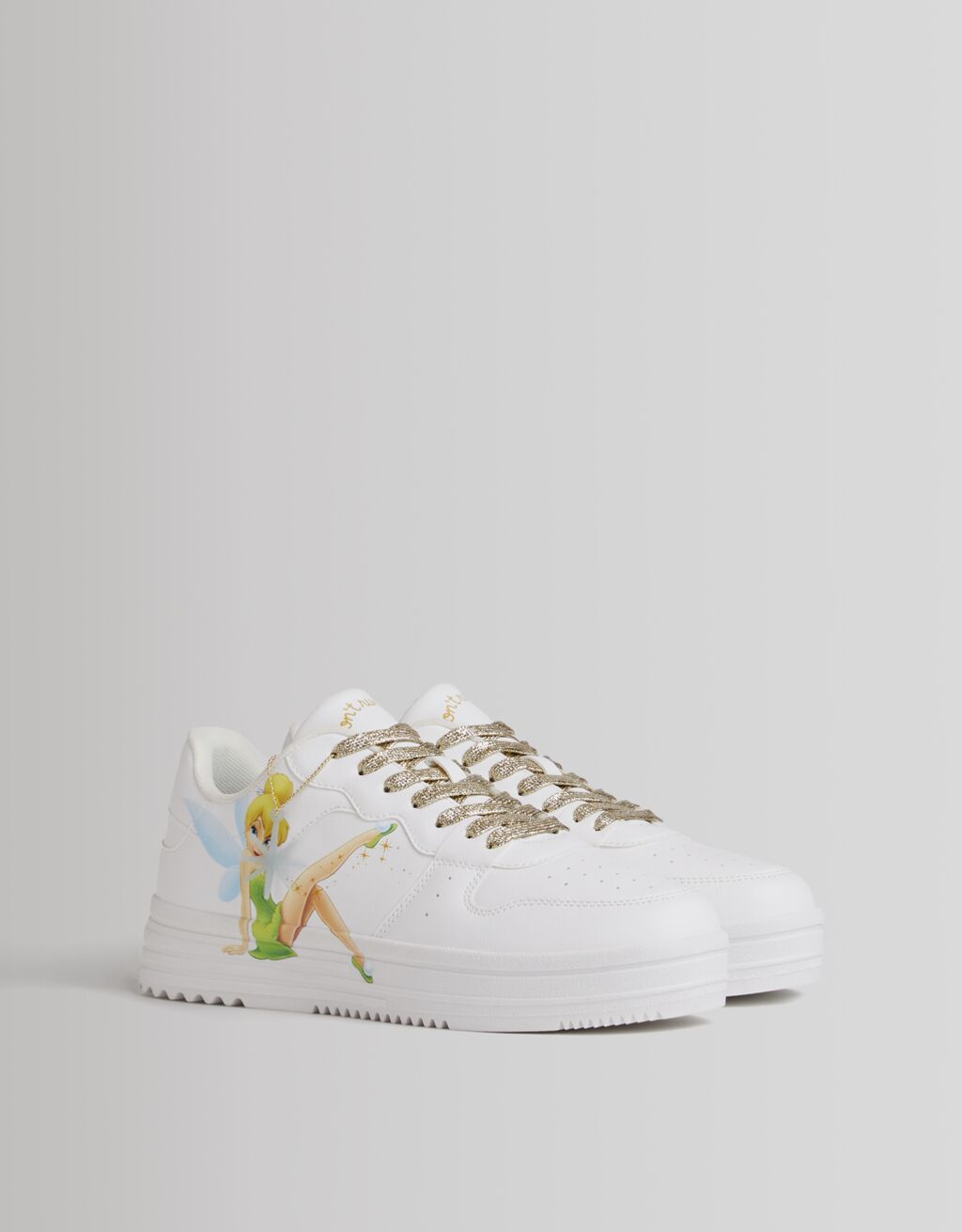 Se trata de unas deportivas de corte clásico con un poco de plataforma. con unos llamativos cordones en tonos dorados y dibujo de Campanilla en los laterales. Además, vienen con un llavero con forma de estrella.