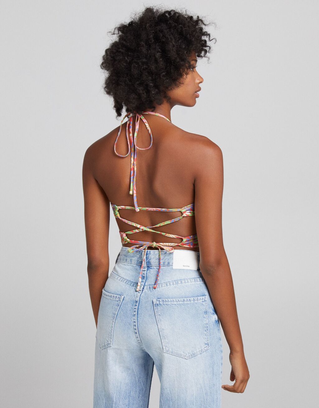 Quieres lucir tu perfecto bronceado en tu espalda, busca en alguna delas tiendas Bershka este excitante Top halter print lace up espalda. Una delicada prenda de vestir con la espalda al descubieto, con delicados y finos tirantes que se cruzan y se amarran en la espalda y en el cuello.