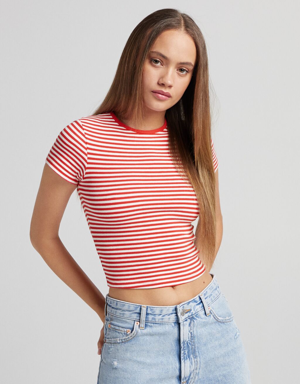 Otro hermoso modelo para lucir en primavera es esta Camiseta rib manga corta. En corte recto, cuello redondo, en talle corto y ajustada a tu cuerpo. Puedes buscar el color de tu preferencia, así se te hará mucho más fácil su combinación.