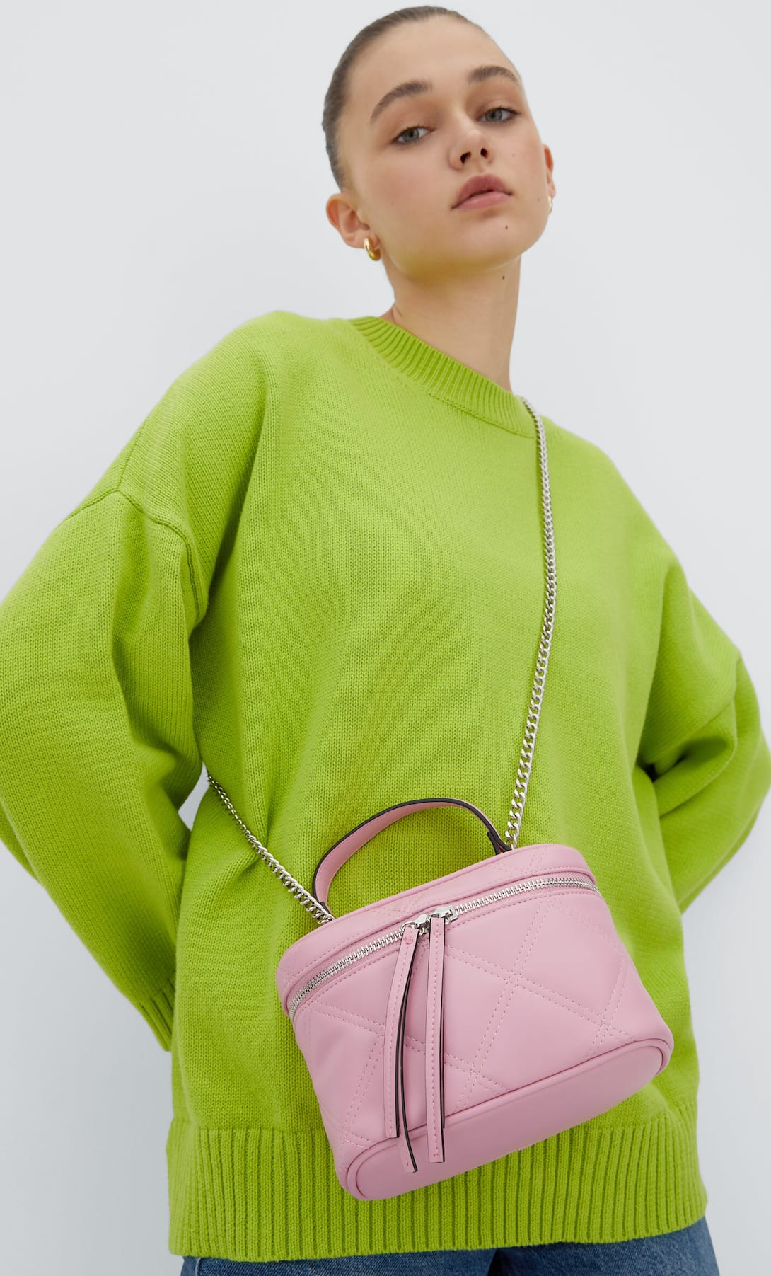 Puedes llevarlo como bolso de mano o estilo bandolera con su cadena metálica. Tiene el tamaño perfecto para contener todas tus cosas y además está disponible en varios colores, aunque a nosotros nos encanta este en rosa maquillaje.