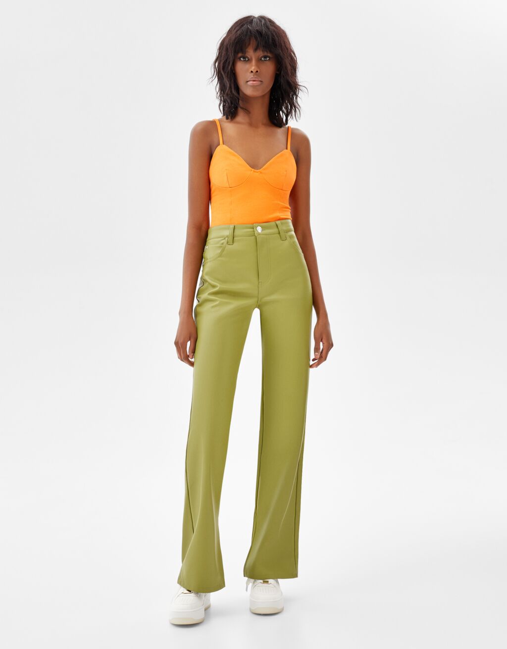 En diseño recto, tiro alto y talle largo, sus bolsillos funcionales, cierre de cremallera, botón metálico y delicadas trabillas. Sus perneras ajustadas y sus bajos un poco anchos. Destaca todo tu estilo y exhibe tu figura con un ajustado top. En color kaki y puedes llevarlo por 25,99 euros.