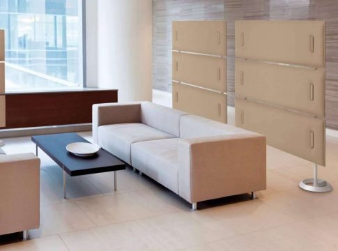 De igual forma, entre los productos fonoabsorbentes de OfficeDeco también se puede encontrar el modelo divider, que específicamente se utiliza para dividir espacios más grandes. Visualmente, se juntan tres paneles que se sostienen a una base de acero. Se desarrolla en modelos sencillos o dobles, para una división más afirmada.