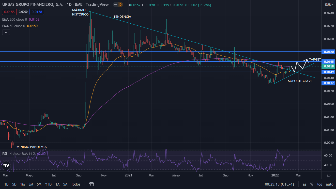 A nivel técnico, Urbas ha sido bajista durante casi todo el 2021, perdiendo cerca del 40%. Tras dicha caída, el precio se ha visto soportado en los 0,013 euros. El día 3 de enero de este año pasaba a alcista, subiendo un 23% en 8 días. Actualmente el precio se sitúa en los 0,015 euros, siendo este un nivel clave. Para el corto plazo, si no pierde los 0,015 euros, el precio irá alcista, alcanzando los 0,017 euros.