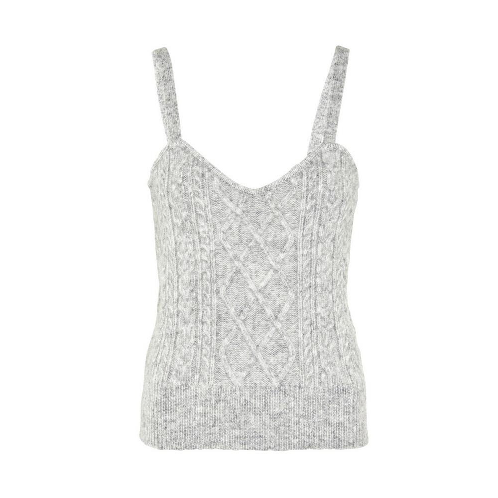 Culminamos con una camiseta de tirantes gris de punto de ocho, fácil de combinar, ideal para lucirla una tarde de primavera o salir de paseo cualquier fin de semana. Cómoda, con delicados tirantes sobre tus hombros, podrás exhibir todo tu bronceado.