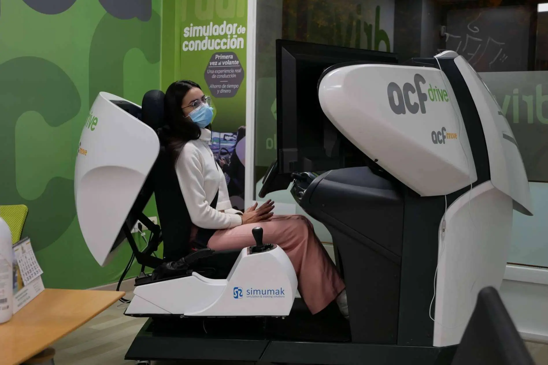 ACF Drive cuenta con simuladores desde 2006 y, concretamente, con un simulador de coche Simescar desde 2016. Hace tres años, introdujo para todos los alumnos una serie de horas que necesariamente se tenían que realizar en el simulador. Con el tiempo, al detectar los profesores esta ventaja de los alumnos que usaban el simulador de coche frente a los que empezaban de cero la empresa, decidió diseñar un curso específico en el que la mitad de las clases prácticas se realiza con simulador.