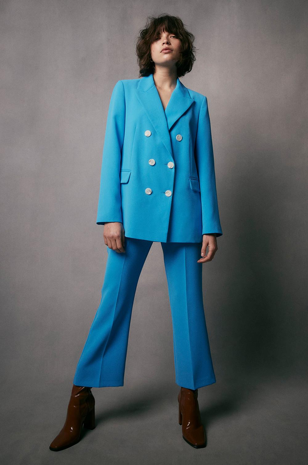 Un azul tan primaveral que lleva de lleno tu mente al mar. Con un corte masculino y un tanto oversize que te permitirá ir a la última en cuanto a tendencias. Si quieres hacer un total look, tienes los pantalones a juego.