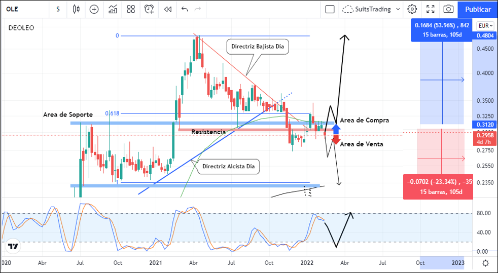 Sin embargo, debemos prever que la ubicación del precio por debajo de dichas áreas se ha dado en gran parte por la situación macroeconómica más que por los resultados propios de la compañía lo cual indica que una vez, la tensión disminuya, seguramente el precio podrá retomar su camino alcista siempre y cuando esté acompañado de unos datos fundamentales apropiados. Si el precio se logra ubicar nuevamente por encima del área de soporte en 0,32 euros, señalaría compras en busca de los máximos de 2021 arriba de 0,47 euros, lo que indica más de un +50% de beneficio a largo plazo.