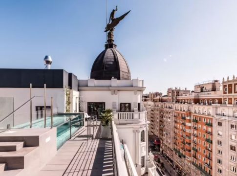 Por otro lado, la vivienda está rematada por una espectacular terraza panorámica de uso común, que dispone de una piscina, con vistas a la Gran Vía, al Palacio Real y a la Iglesia de San Francisco el Grande, entre otros. Se completa con un amplio gimnasio de uso comunitario, situado justo debajo de la cúpula, y de una sala gourmet.