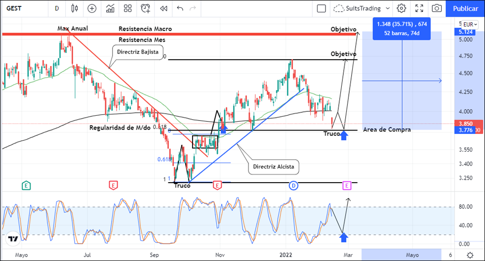 Técnicamente es imprescindible que, para confirmar el punto de giro al alza sobre la acción de Gestamp, se desarrolle sobre el área de regularidad del mercado un truco, es decir, V invertida respetando los 3,7 euros por acción desde donde podrá tomar el impulso necesario para buscar como primer objetivo los máximos del año arriba de 4,6 euros por acción y posteriormente como segundo objetivo, el precio de referencia máximo anual de 2021 donde precisamente se encuentra una resistencia macro mensual en inmediaciones de los 5 euros por acción. Este movimiento al alza representa entre el 24% y 35% de beneficio estimado a largo plazo.