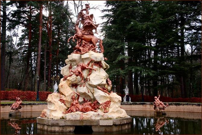 Los jardines de la Granja Real de San Ildefonso lucen decenas de fuentes espectaculares, pero hay una que destaca sobre todas ellas. Se trata de la que está dedicada a la Fama, la obra de Demaudré y Pitué. La figura mitológica está representada tocando una trompeta de la que brota un gran chorro de agua que se eleva hasta 47 metros de altura. La Fama se encuentra de pie sobre Pegaso, que a su vez se yergue sobre varios guerreros derrotados, mientras acechan figuras que representan la maldad, la ruindad, la envidia y la ignorancia.